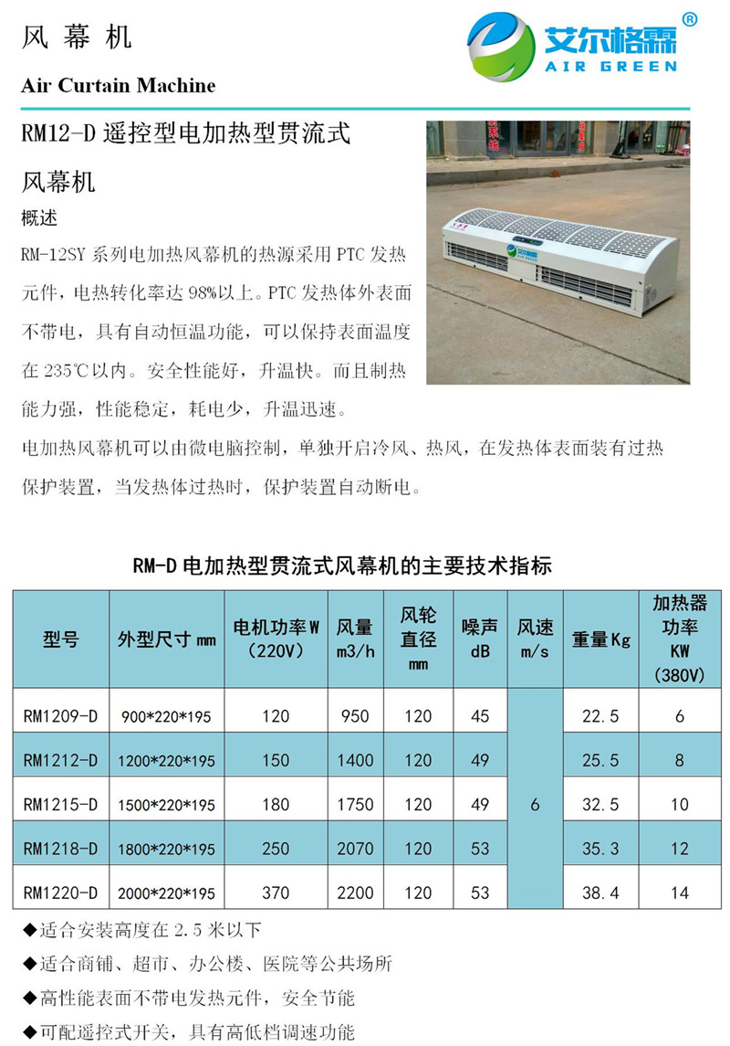 RM-D系列電加熱風(fēng)幕機(jī)的熱源采用PTC發(fā)熱元件,電熱轉(zhuǎn)化率達(dá)98%以上。PTC發(fā)熱體外表面不帶電,具有自動恒溫功能,可以保持表面溫度在235℃以內(nèi)。安全性能好,升溫快。而且制熱能力強(qiáng),性能穩(wěn)定,耗電少,升溫迅速。