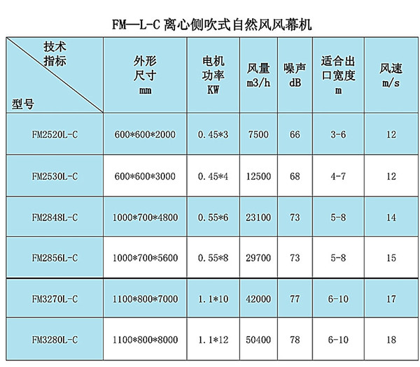 FM-L-C-離心側吹式風幕機是在A系列基礎上的改進機型,采用小型離心風機,外形更美觀,風機噪音低。適合安裝在高度4米以上,寬度6米以內的門洞側面。適用于大型的商場、倉庫、廠房的高大門洞使用。