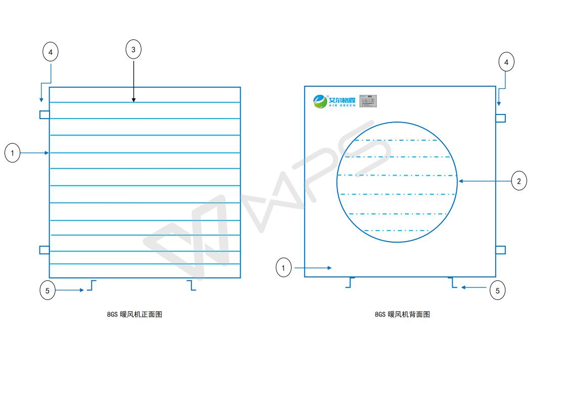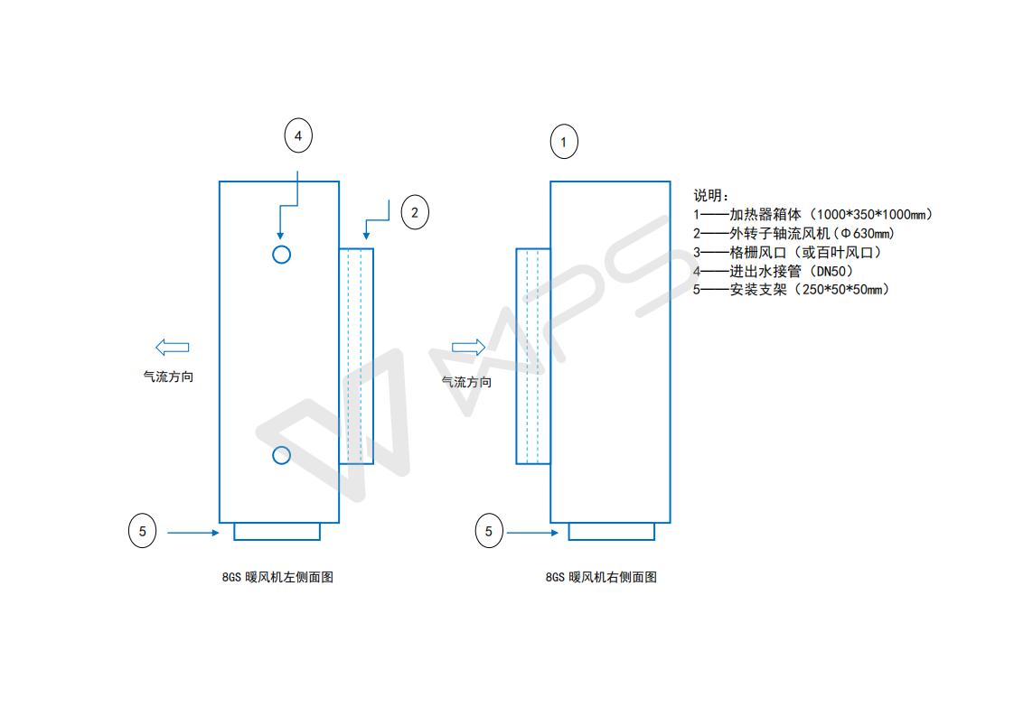 8GS熱水暖風(fēng)機的外形尺寸,8GS熱水暖風(fēng)機采用4排管鋼管加熱器,外轉(zhuǎn)子軸流風(fēng)機,出風(fēng)口尺寸1000*1000mm,