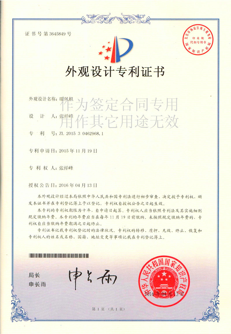 由德州艾爾瑪空調(diào)生產(chǎn)的“艾爾格霖”品牌GS/TS/Q/D/型工業(yè)暖風(fēng)機(jī)系列,近日取得國家知識(shí)產(chǎn)權(quán)局頒發(fā)的《外觀設(shè)計(jì)專利證書》。專利號(hào):ZL201530462968.1