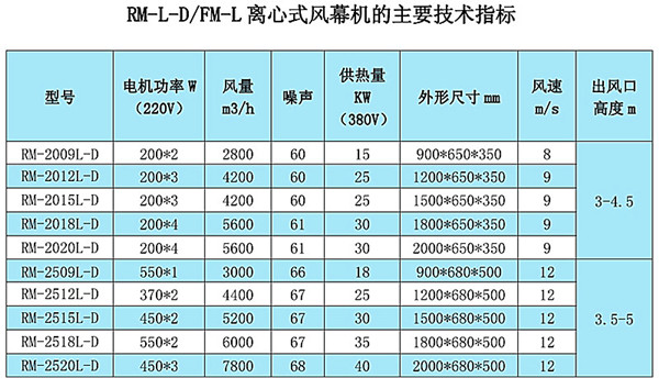 RM-L-D型電加熱離心式熱風幕機、FM-L自然風型離心式風幕機由單速離心風機、金屬翅片管電加熱器(自然風型不帶電加熱器)、百葉風口、鋼板外殼組成。選用200mm或250mm離心風輪,風量大、風速大、風壓高,隔斷效果優(yōu)良,形式多樣,保護功能齊全,適用于大型工業(yè)建筑、停車場、庫房等場所的高大出入口使用。適合3米-5米的安裝高度。