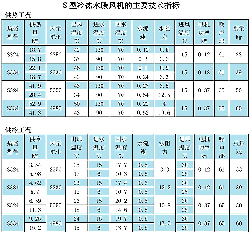 2.S型冷熱水暖風(fēng)機(jī),當(dāng)熱媒與冷媒共用熱交換器時(shí),熱水溫度不宜高于65℃,冷媒宜采用供水溫度為6-15℃的冷水,若熱水溫度高于65℃,則應(yīng)由防止結(jié)垢的有效措施,以供冷時(shí)的熱交換效果。