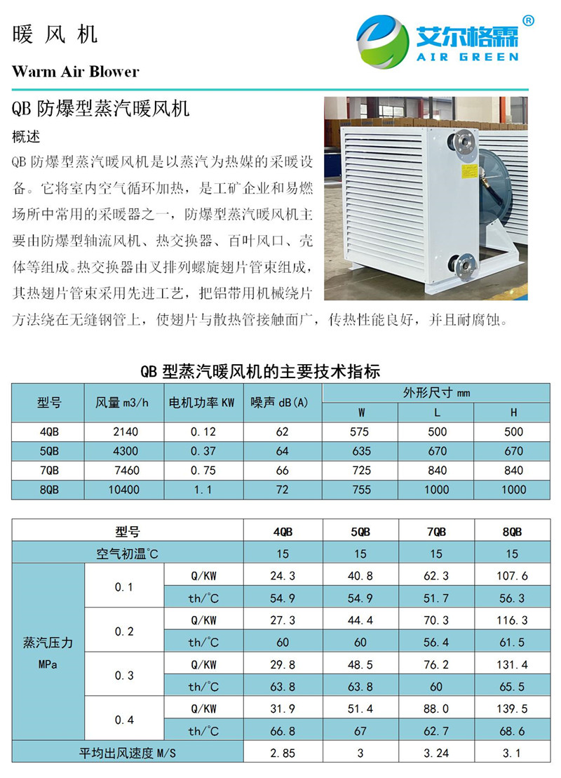 Q-B防爆型蒸汽暖風機是在普通型蒸汽暖風機基礎上的延伸產(chǎn)品。采用BT35-11防爆型軸流風機,適合煤礦、化工等特殊行業(yè)。
